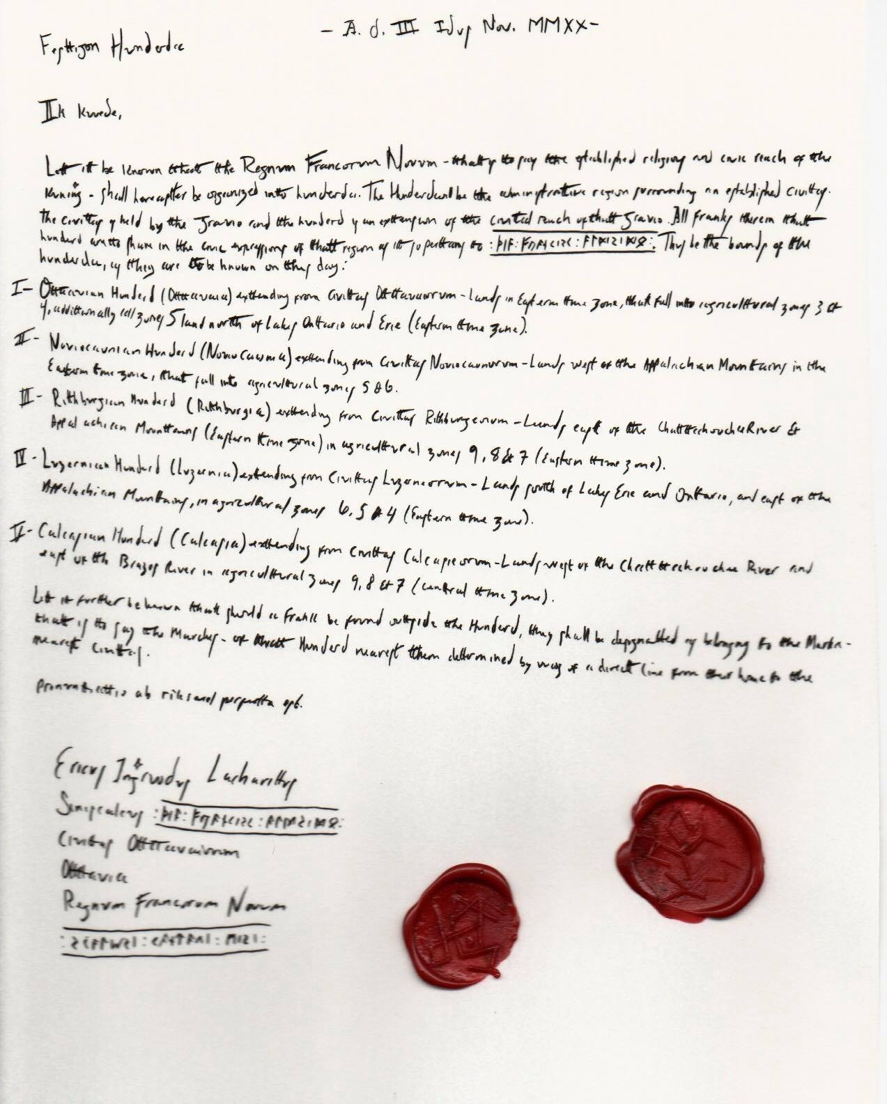 Let it be known that the Regnum Francorum Novum – that is to say the established religious and civic reach of the Kuning – shall hereafter be organized into the Hunderda. The Hunderd will be the administrative region surrounding an established Civitas. The Civitas is held by the Gravio and the Hunderd is an extension of the Civital reach of that Gravio. All Franks therein that Hunderd are to share in the civic expressions of that region as it so pertains to Thia Frankisk Aldsido. Thus be the bounds of the Hunderda, as they are to be known on this day: