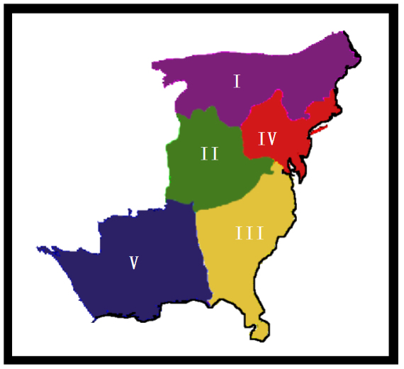 V – Calcasian Hunderd (Calcasia) extending from Civitas Calcasieorum – Lands west of the Chattahoochee River and east of the Brazos River in agricultural zones 9, 8, and 7 (Central time zone).
